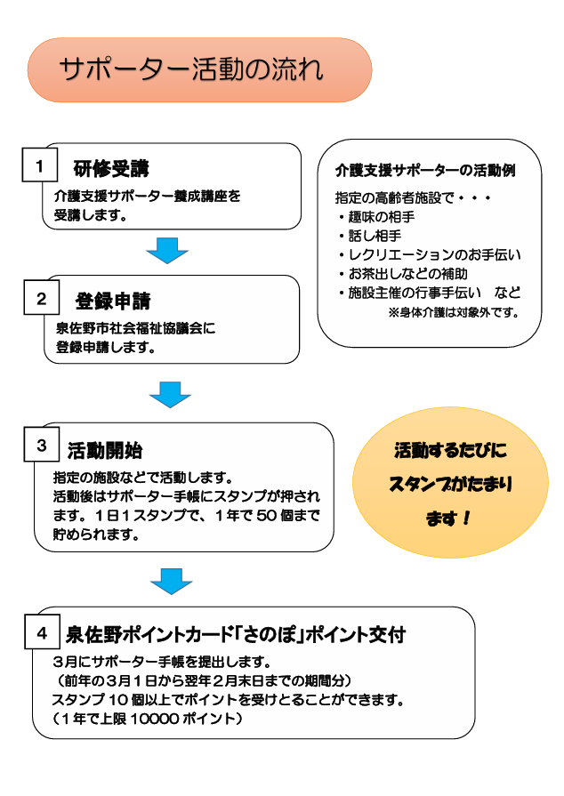 介護支援サポーター事業は、介護支援サポーター養成講座を受け、登録をした65歳以上の方が、市内の介護施設で、介護支援サポーター活動(話し相手、レクリエーションのお手伝い、食事・おやつの配膳など)を通じて、社会参加・社会貢献を行うことにより、ご自身の健康増進を図り、介護予防に積極的に取り組むものです。