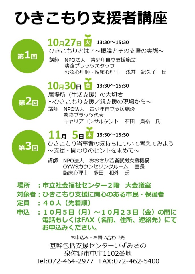 ひきこもり支援者講座(全3回)を開催します。詳細は、下記画像もしくはチラシ(PDF)をご覧ください。