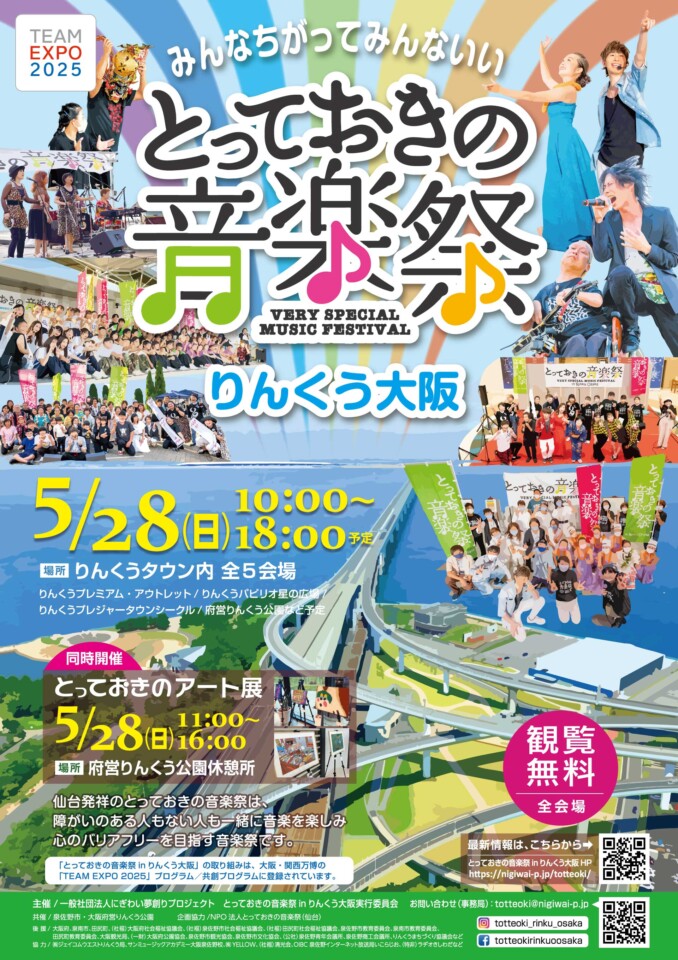 泉佐野市社会福祉協議会も後援させていただいている、一般社団法人にぎわい夢創りプロジェクト「とっておきの音楽祭inりんくう大阪実行委員会」主催のイベント「とっておきの音楽祭inりんくう大阪2023」が5月28日(日)に、りんくうタウン内全5会場にて開催されます。
